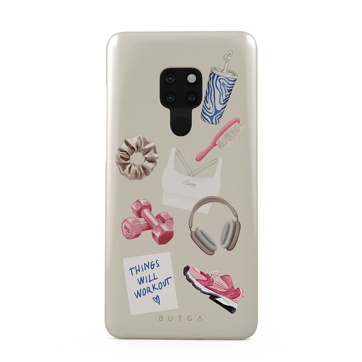 This design features: dumbbells. headphones. tumbler. hairbrush. pink trainers. sports bra. crunchie. Things Will Work Out sticky note
