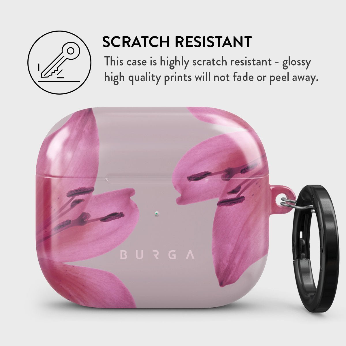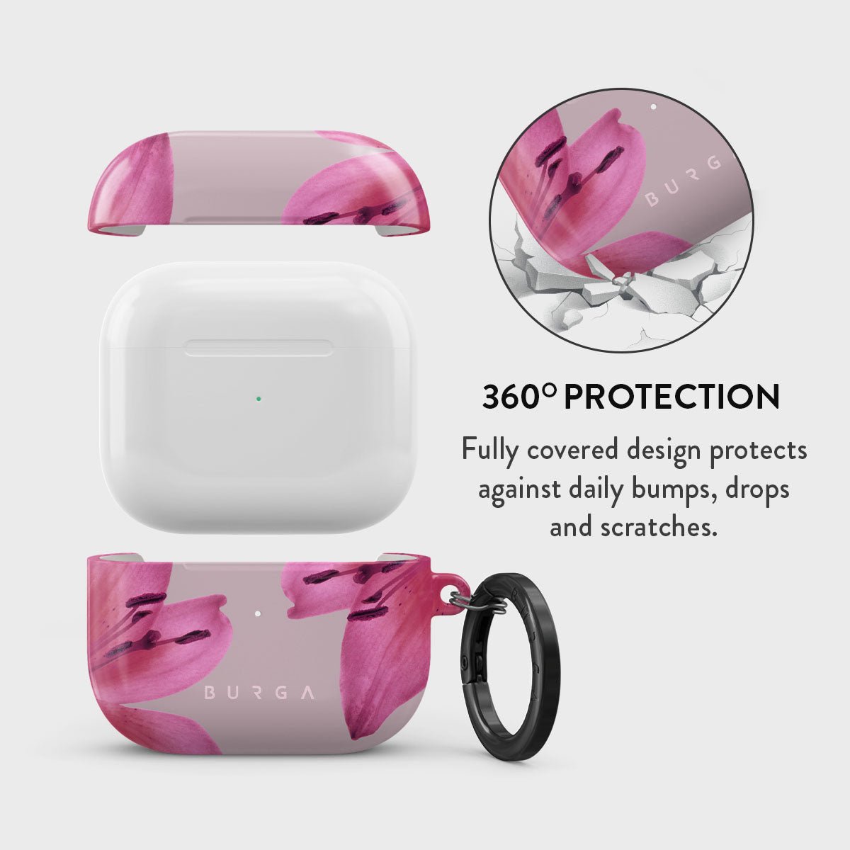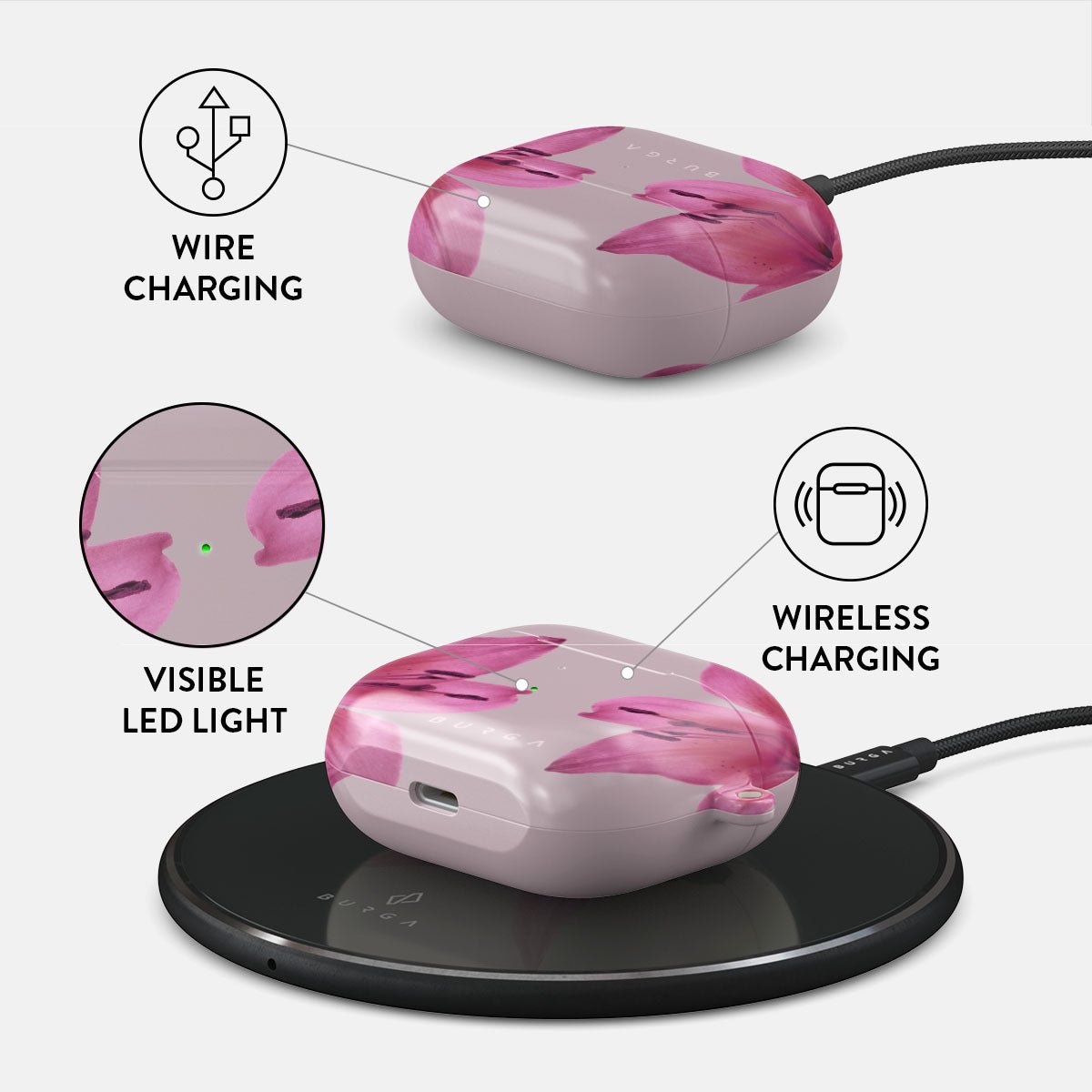 A gentle hush of pink forms where soft lilies sway. Their tender petals — a silent ode to the delicate dance of life. The Fragile Beauty Apple Airpods 3 case cover design invites you to lean into the soft embrace of nature. letting its subtle rhythms guide your journey.