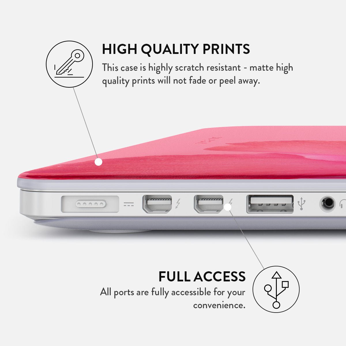 Either way. the BURGA MacBook case is the essential accessory for your everyday portable work-horse. It comes with two separate covers for the top and bottom of your laptop for that 360 protection. Despite this fact. it still maintains a slim profile and doesn’t make your MacBook feel bulky. The bottom cover also has a vent to keep your laptop from overheating when sitting. for example… well… on your lap! What else could you want from a MacBook cover? That’s right – easily accessible ports. Got that covered (or rather. NOT covered) as well.