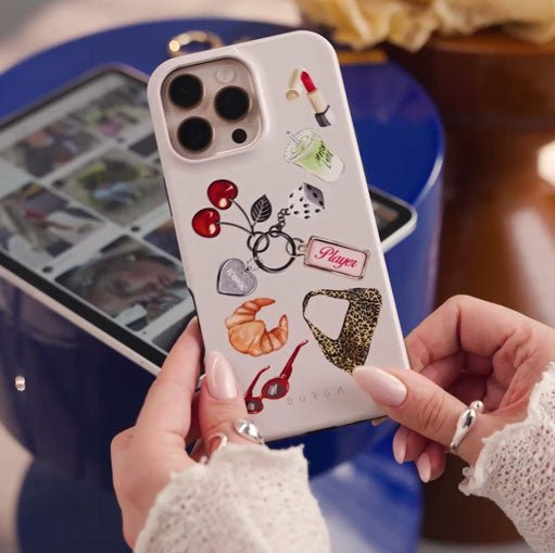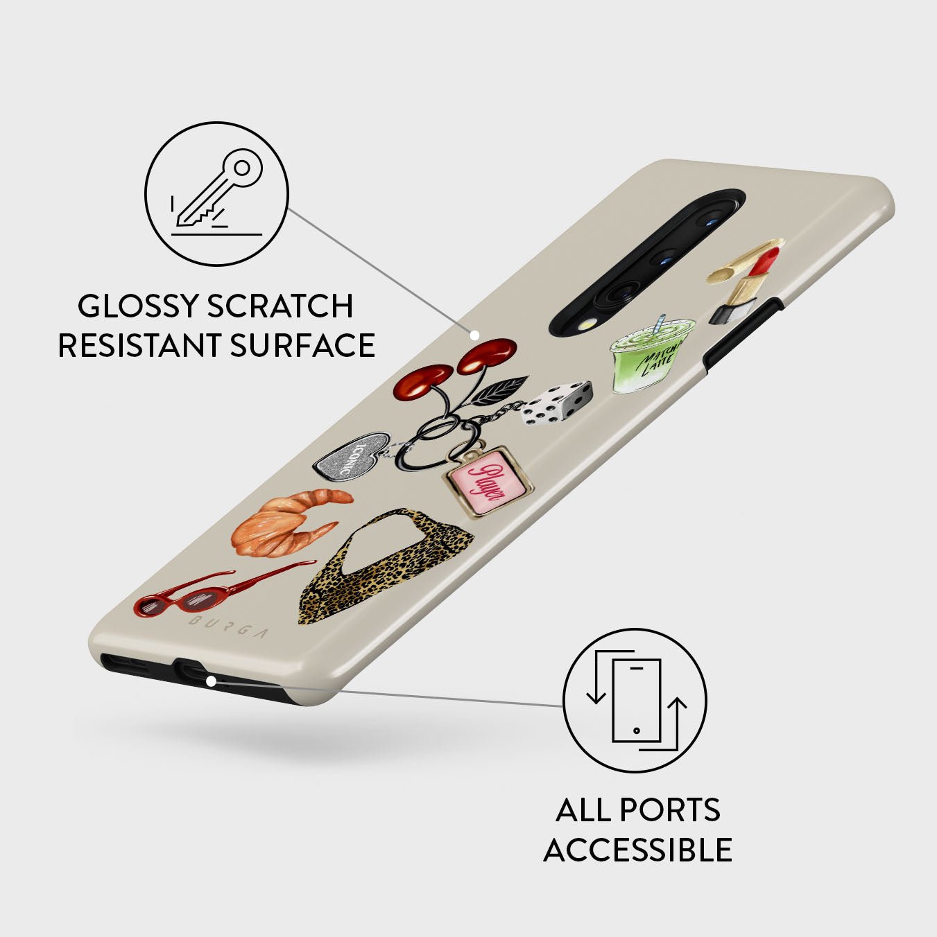 This design features: red sunglasses. red lipstick. green matcha drink. croissant. black dice. leopard-print bag. keychain with silver heart. cherries. dice and Player tag