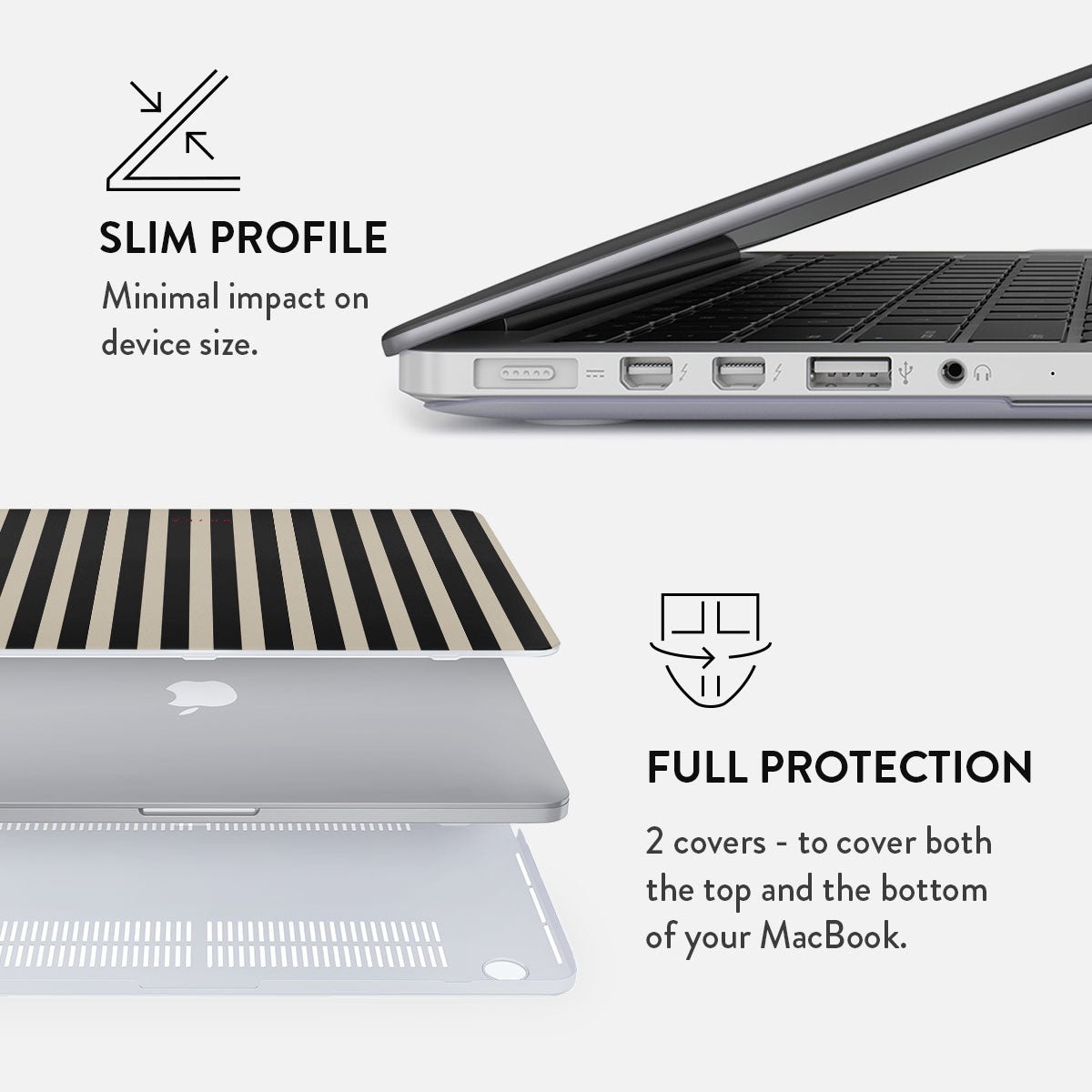 Either way. the BURGA MacBook case is the essential accessory for your everyday portable work-horse. It comes with two separate covers for the top and bottom of your laptop for that 360 protection. Despite this fact. it still maintains a slim profile and doesn’t make your MacBook feel bulky. The bottom cover also has a vent to keep your laptop from overheating when sitting. for example… well… on your lap! What else could you want from a MacBook cover? That’s right – easily accessible ports. Got that covered (or rather. NOT covered) as well.