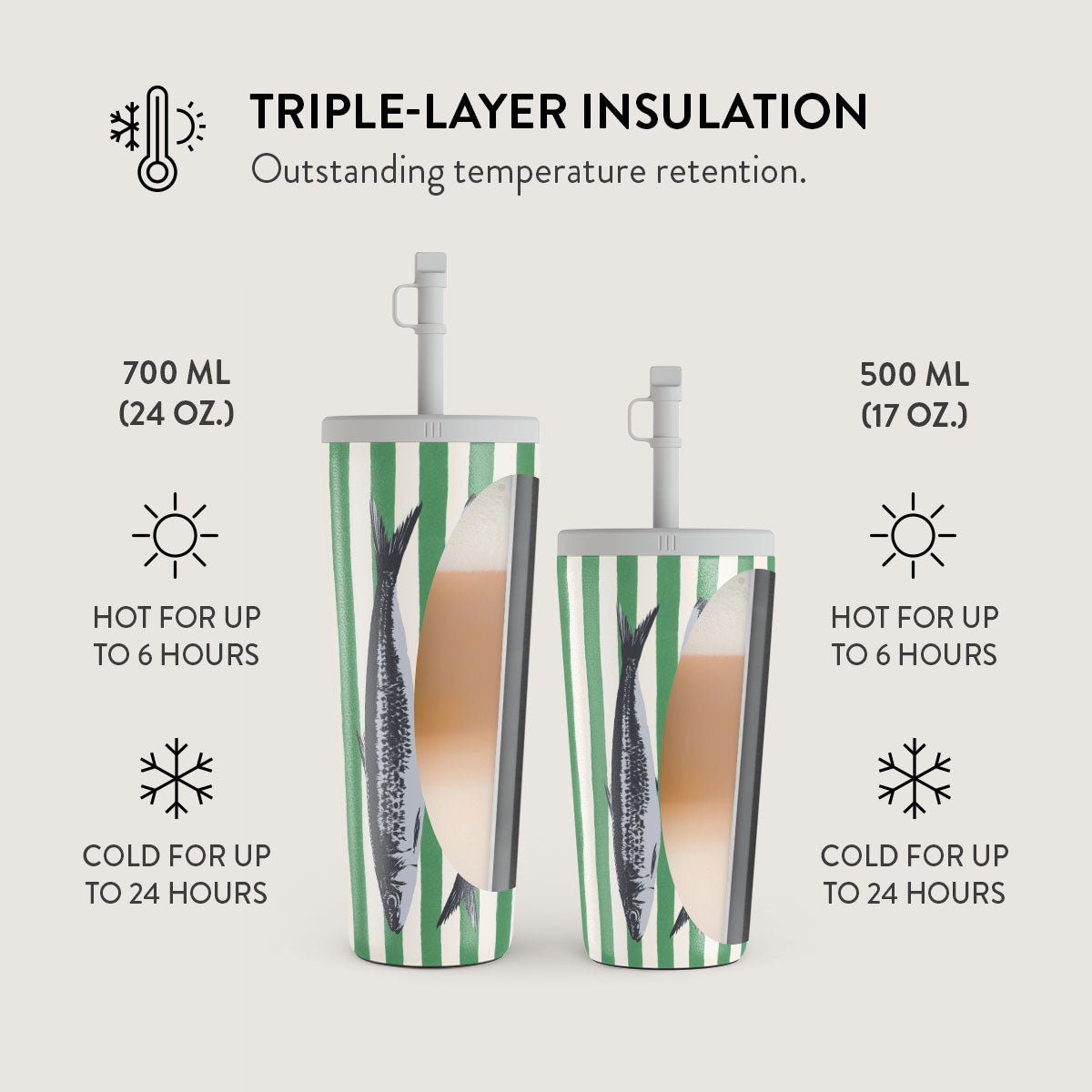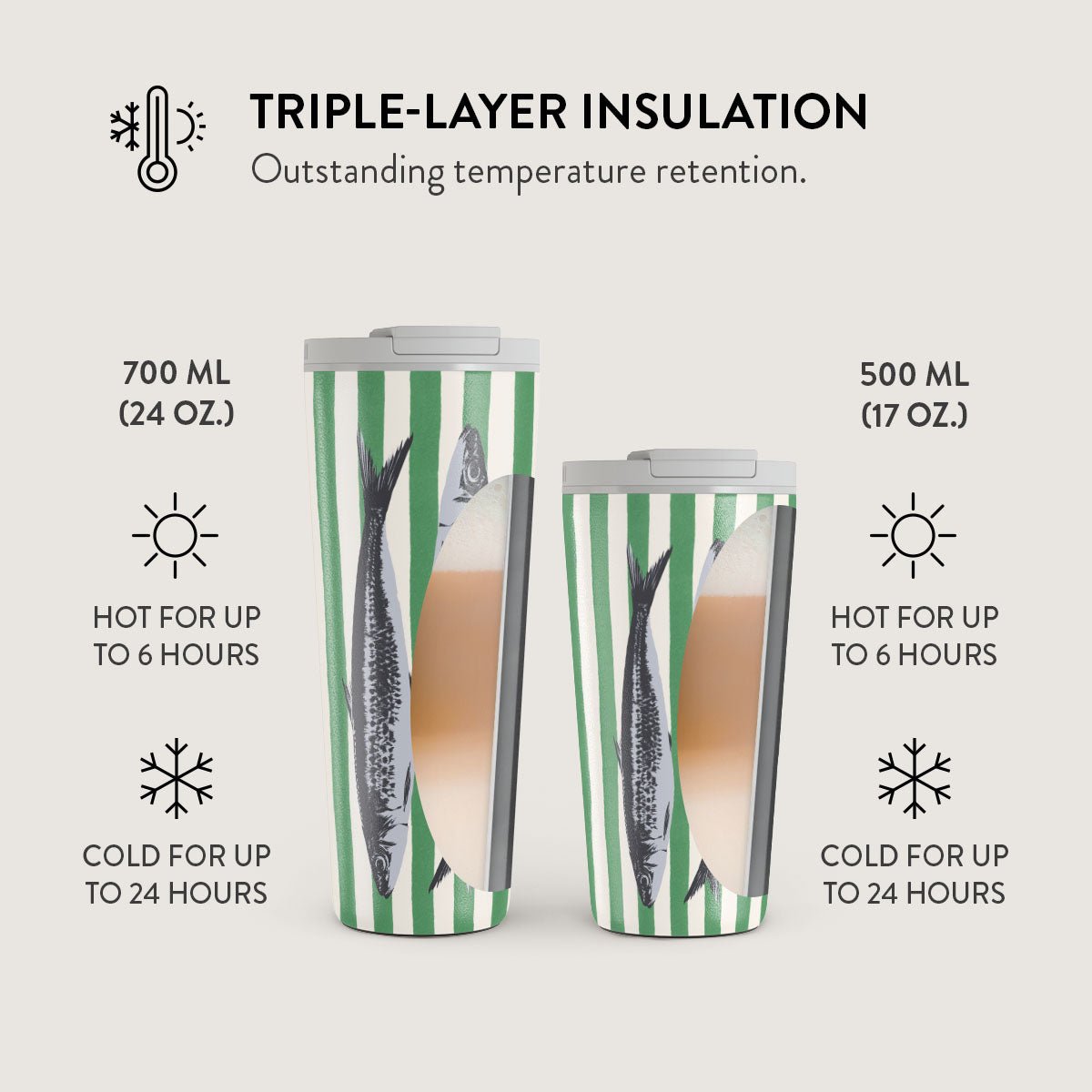 700 ml (24 oz.)Travel Mug: Keeps drinks hot for 6 hours. cold for 24 hours.