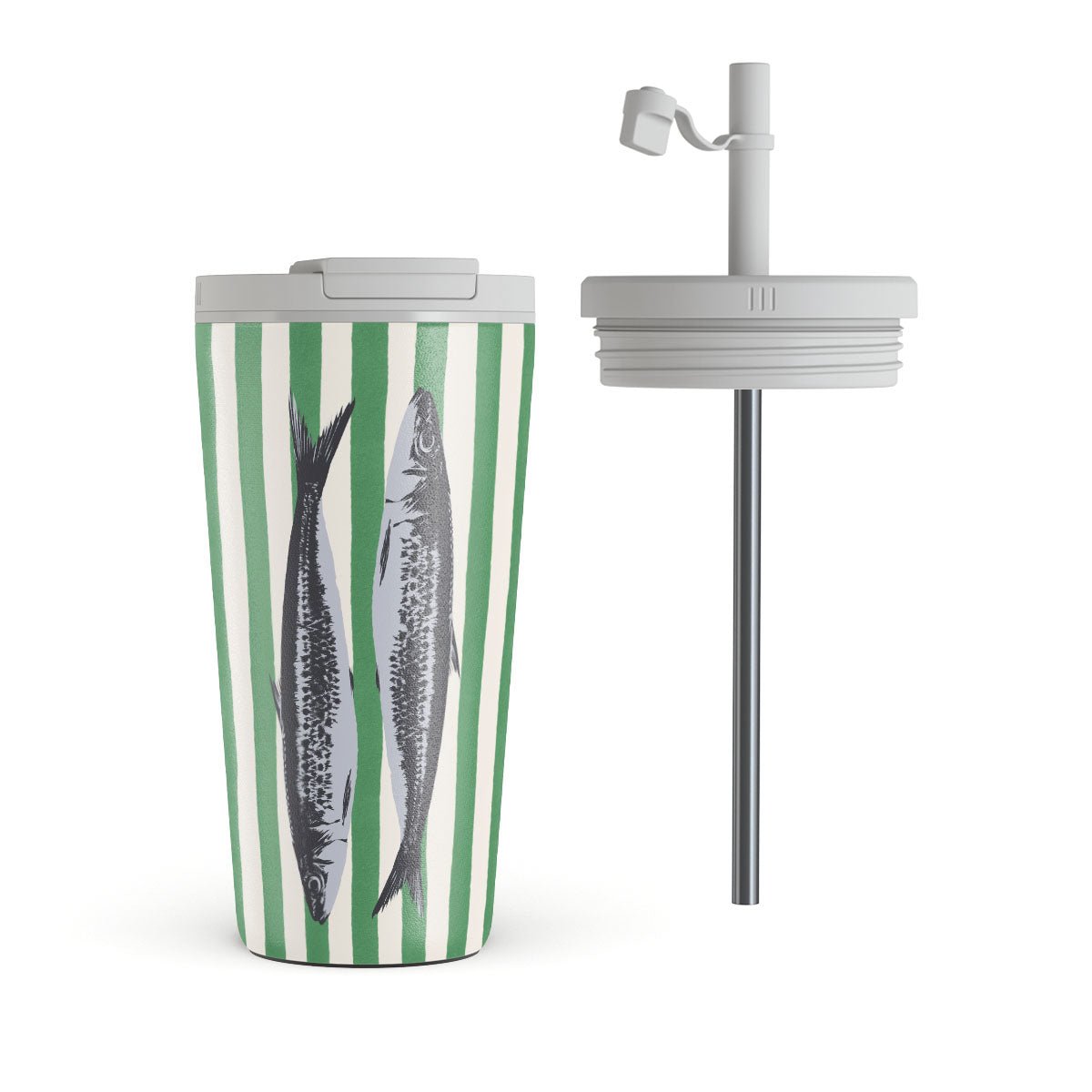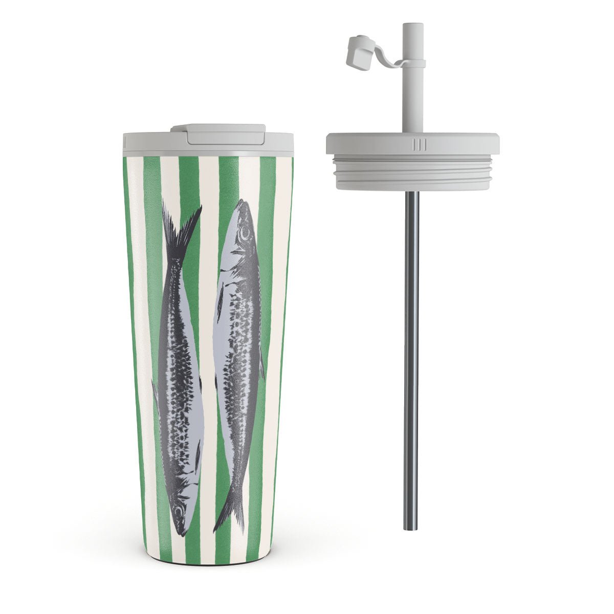 This design features: Sardines. green stripes. ocean motifs.
