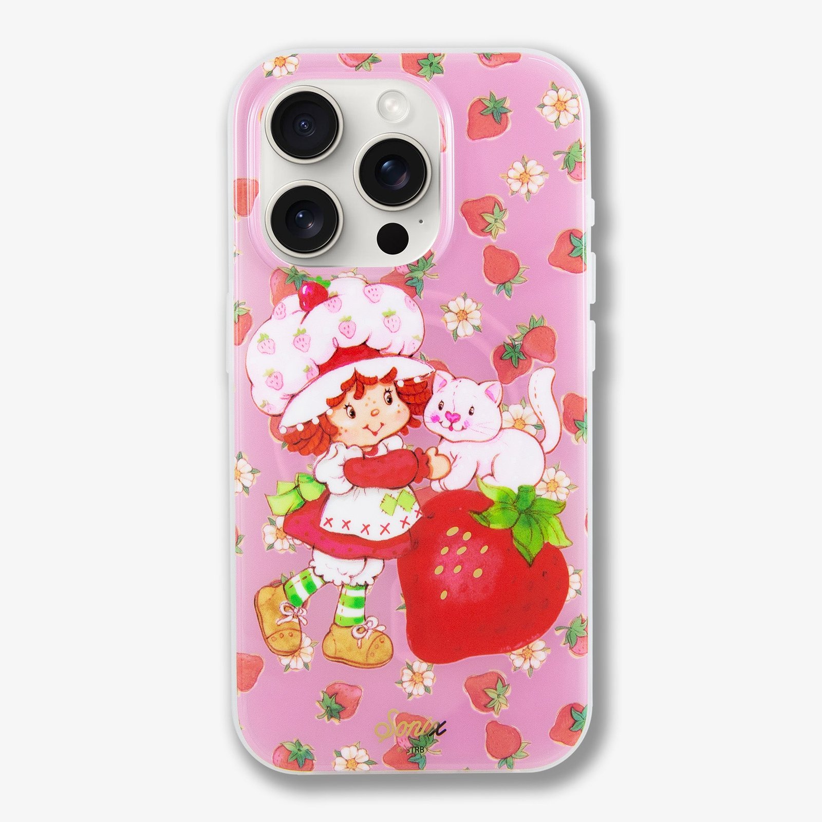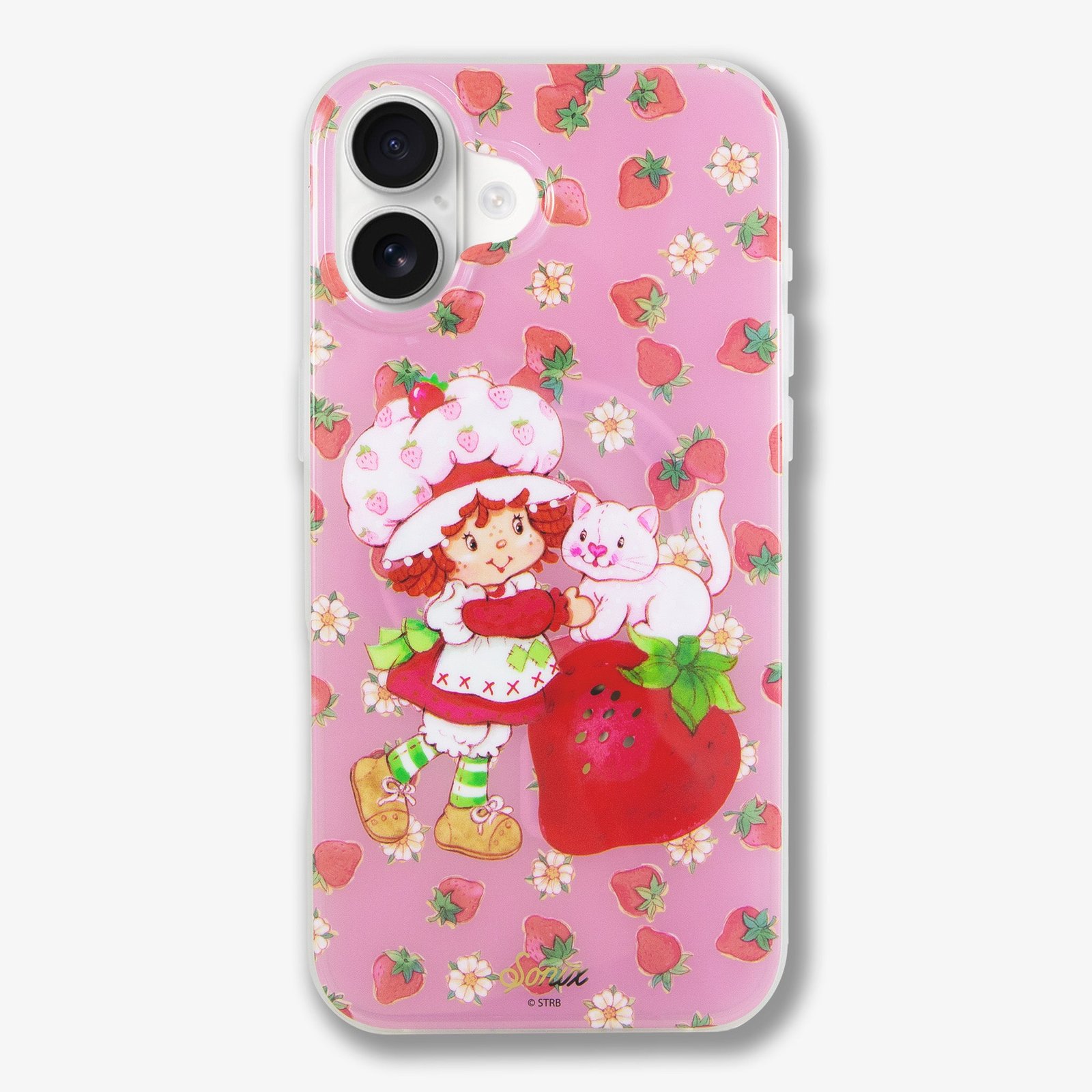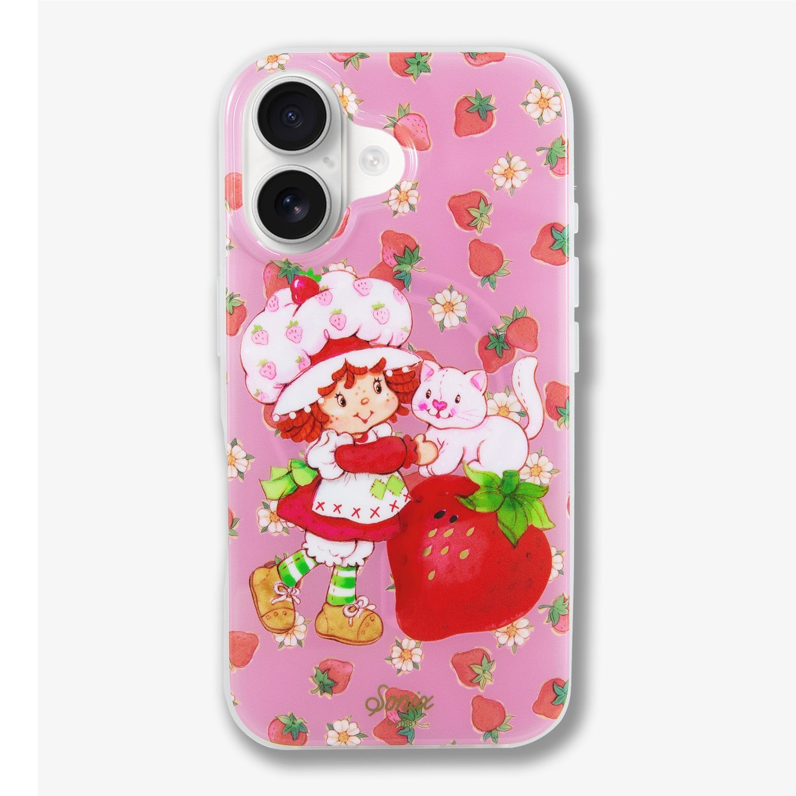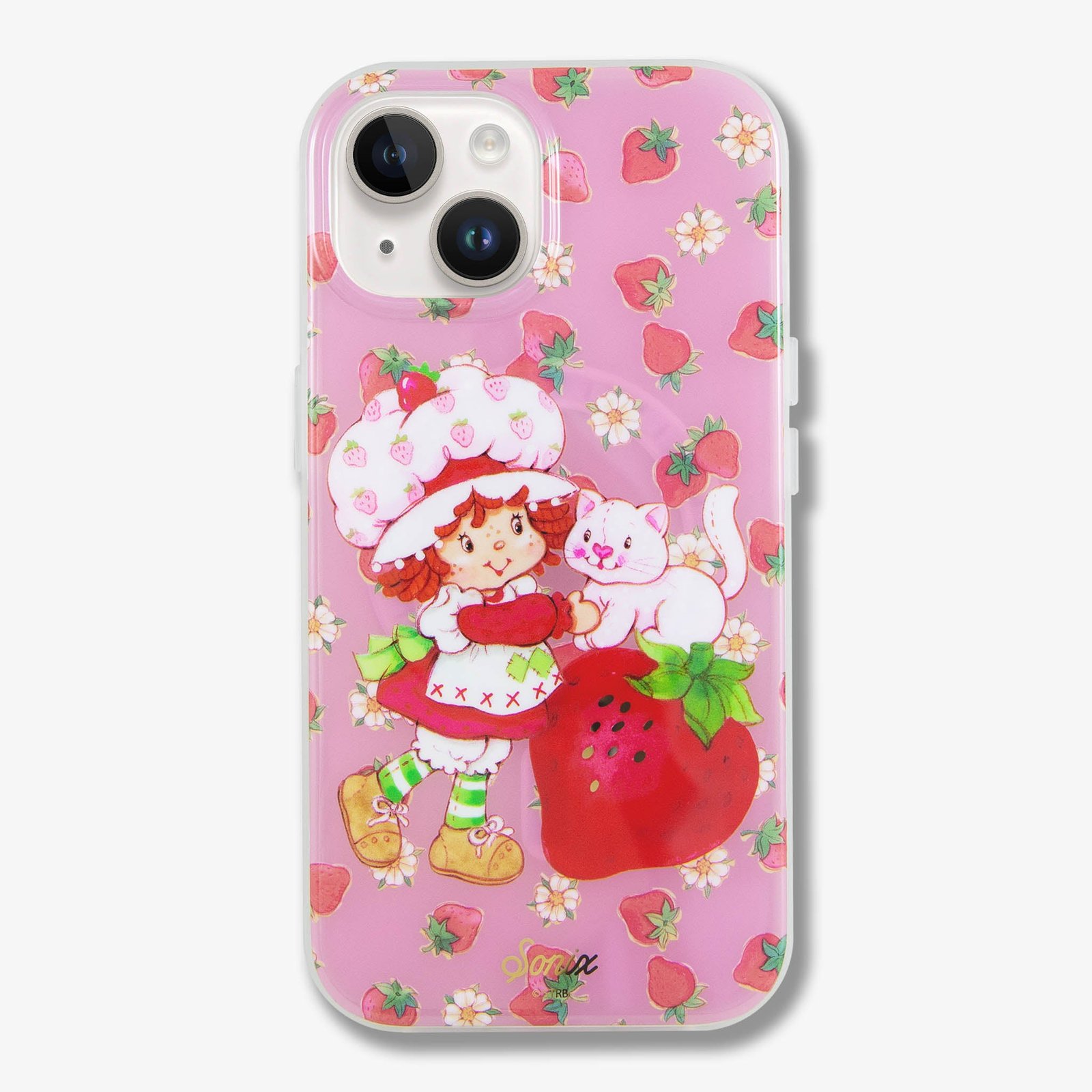 This charming. exclusive Sonix x Strawberry Shortcake™ iPhone case features Strawberry Shortcake™ and her pet cat. Custard. The vintage art showcases Strawberry Shortcake™ wearing her classic red dress. white pinafore. and pink strawberry bonnet. Juicy red strawberries and white flowers are sprinkled about the background of this berry pink jelly case. Sweeten your daily carry with this berry cute MagSafe® compatible iPhone case.