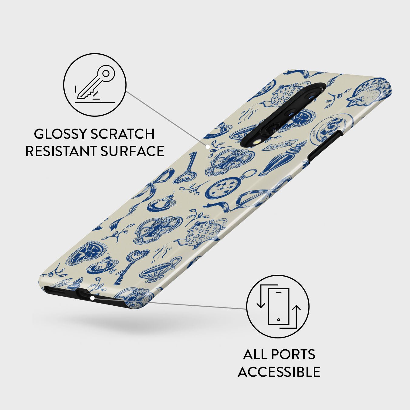This design features: teacups. teapots. pocket watches. key. hearts. ceramics. blue and white pattern