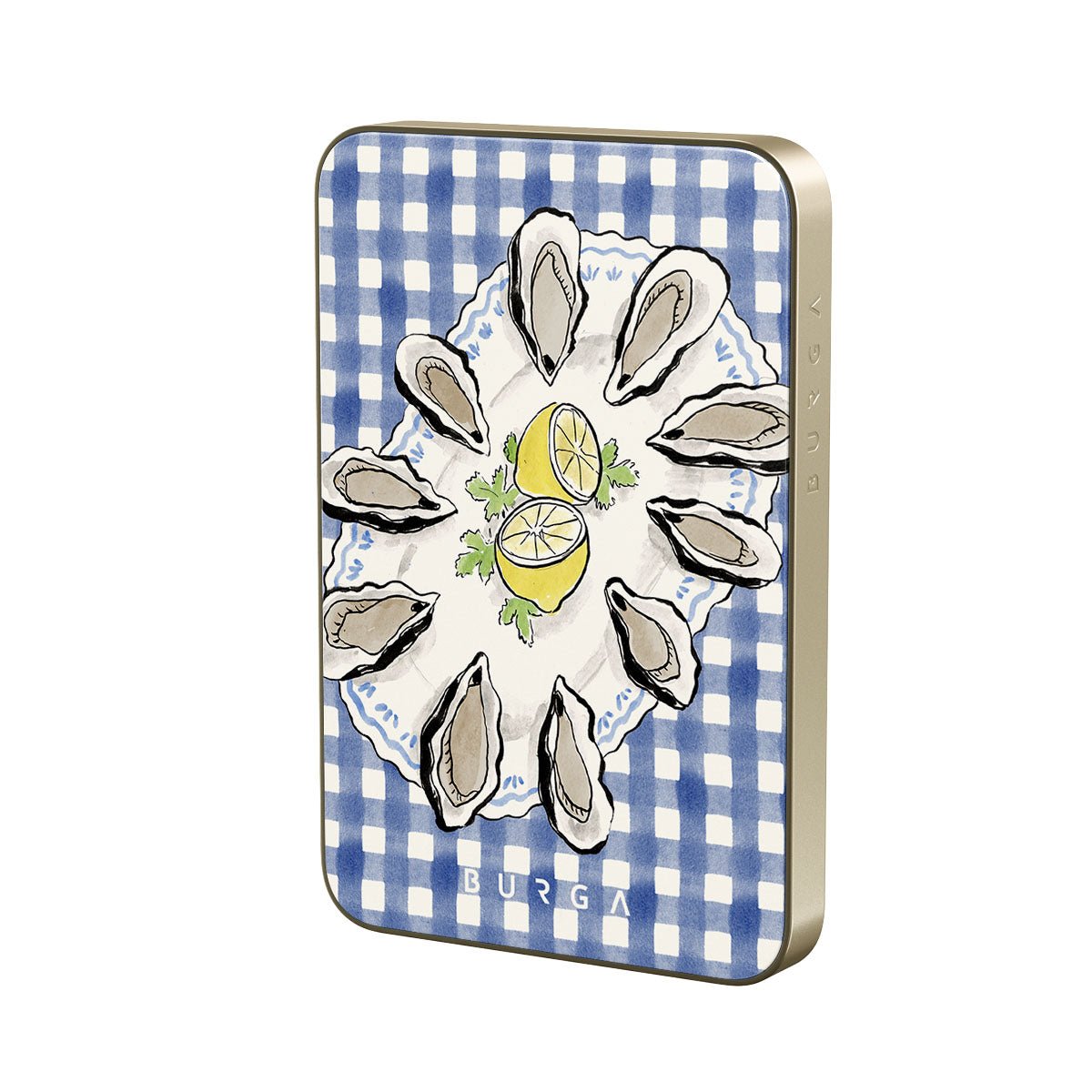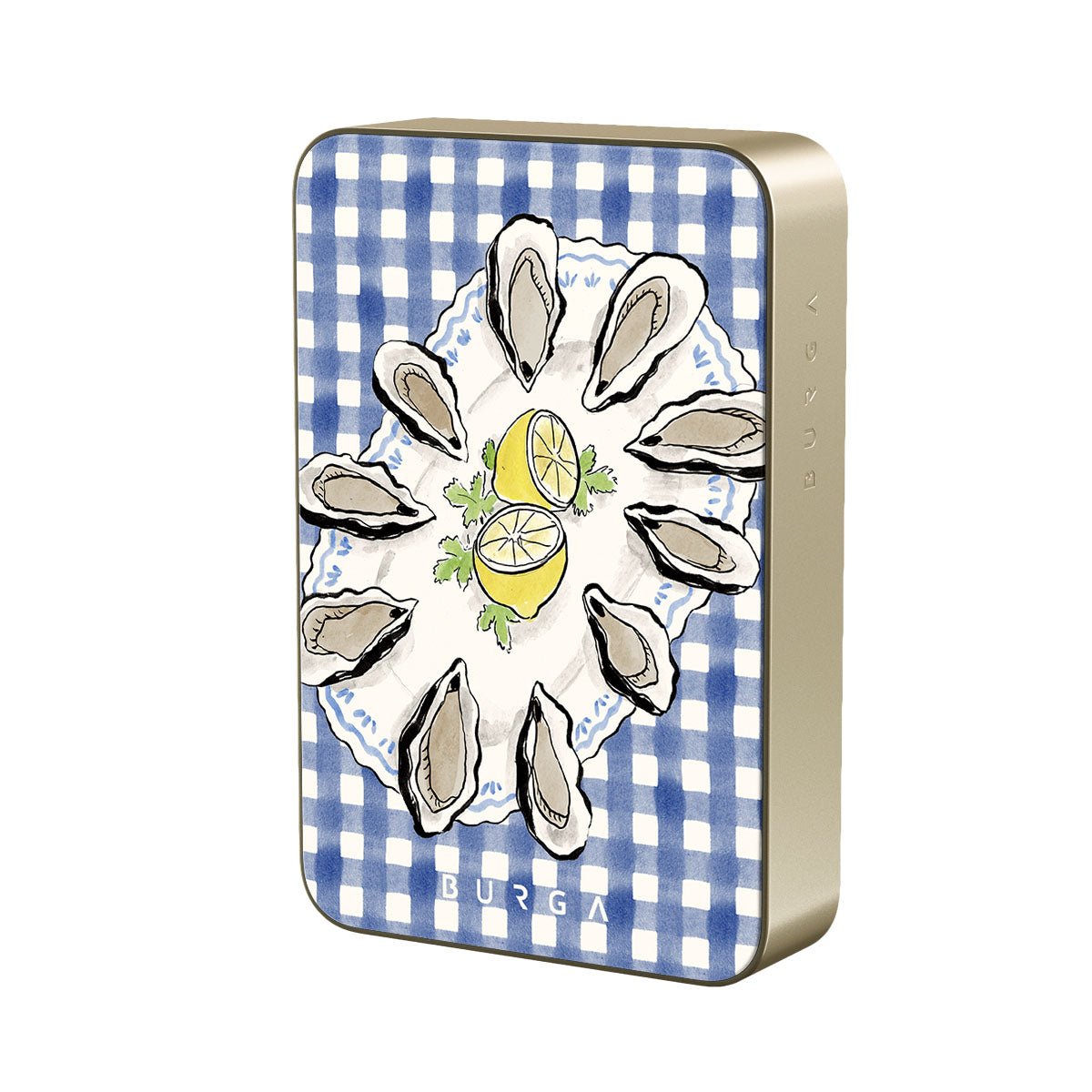 This design features: oysters. lemon. blue gingham. fresh coastal elements. soft pastel tones.